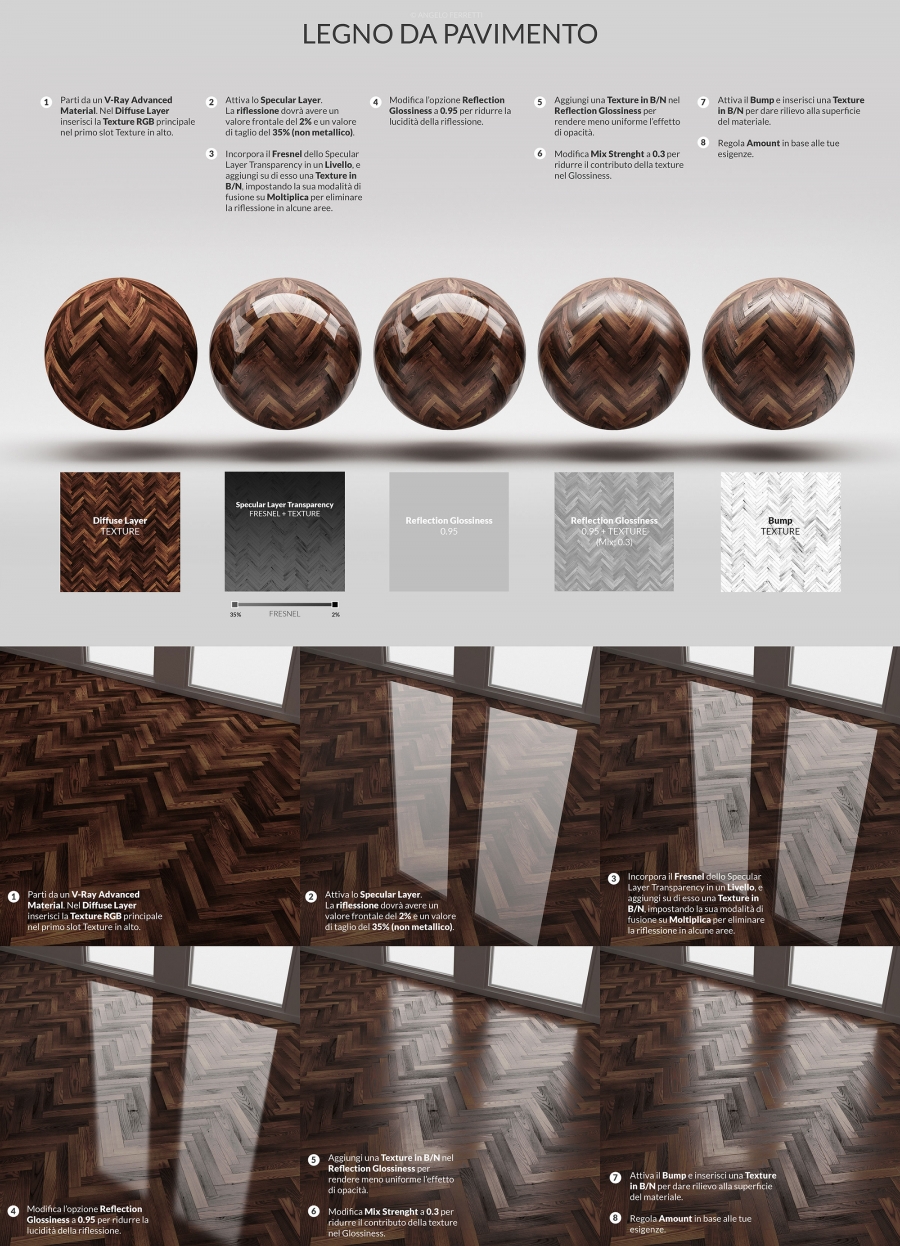 In questo breve tutorial vi mostrerò i passaggi da seguire per ottenere pavimenti in legno dal look realistico con Cinema 4D e V-Ray. Completandolo avrete l’occasione di comprendere meglio come funziona la riflessione nel mondo reale, capire cos’è il Glossiness e come impostarlo al meglio in queste situazioni, scoprire cos’è il Fresnel IOR e come funziona, e tante altre piccole nozioni che potrebbero esservi utili nella pratica di tutti i giorni.