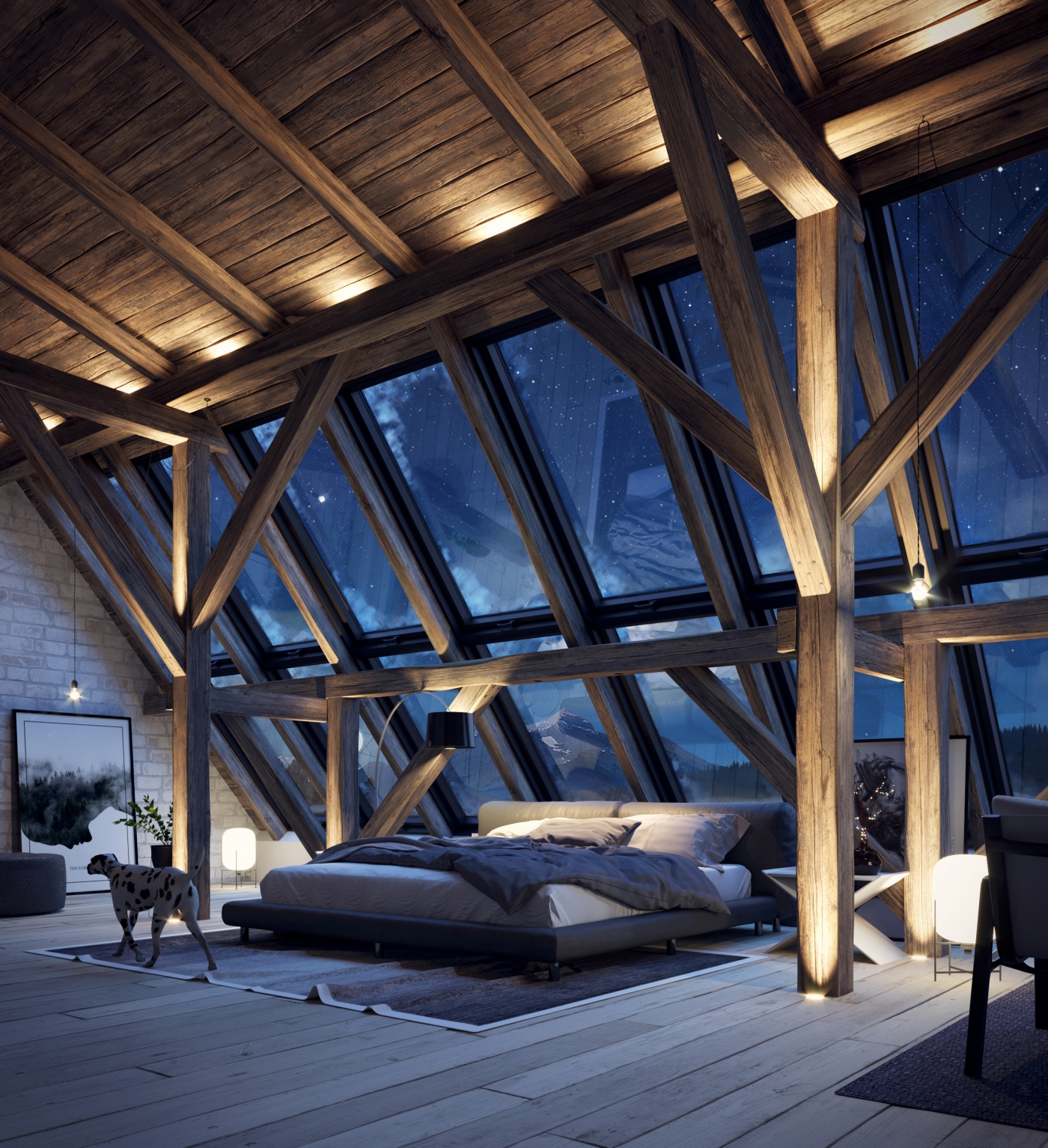 Interior design and visualization for a luxurious modern chalet overlooking the Swiss Alps.