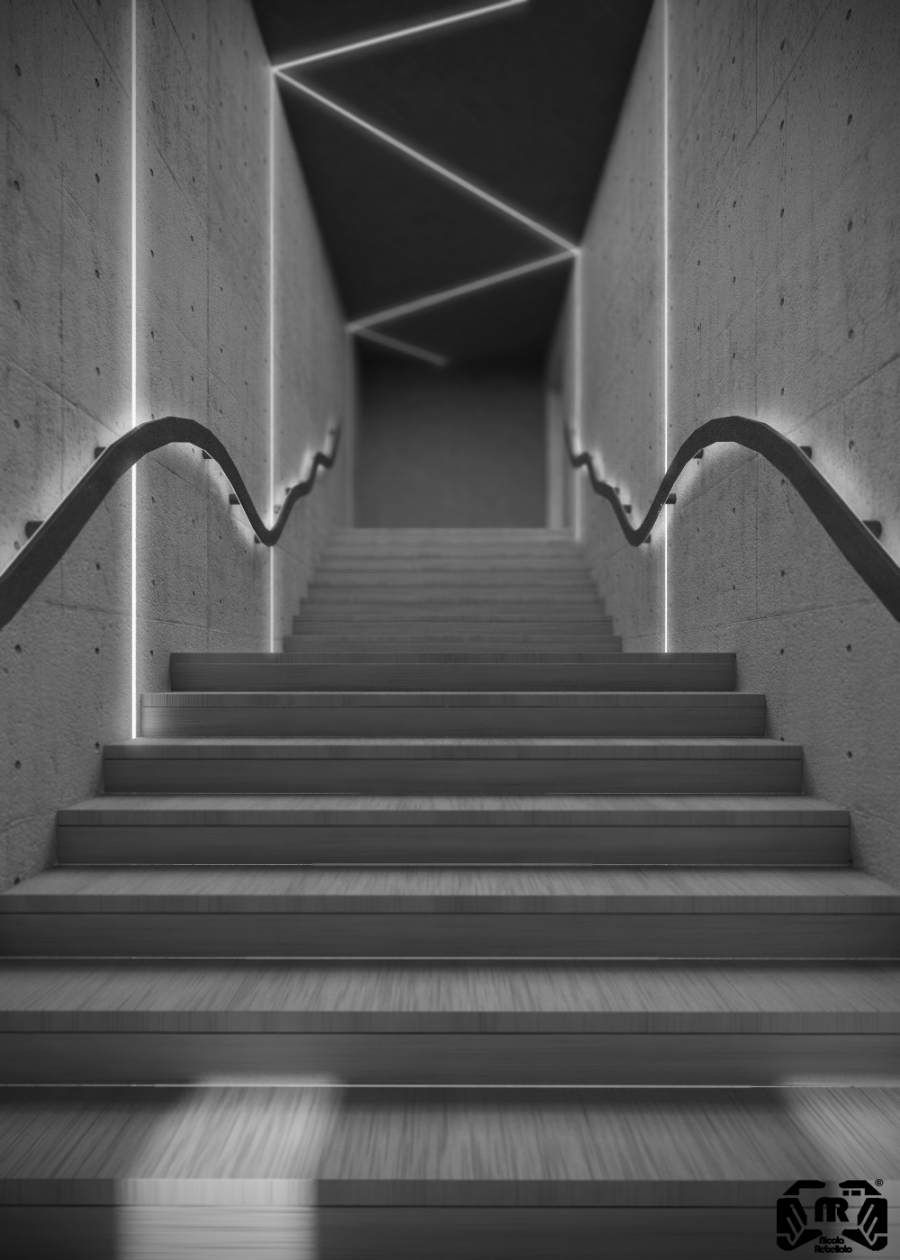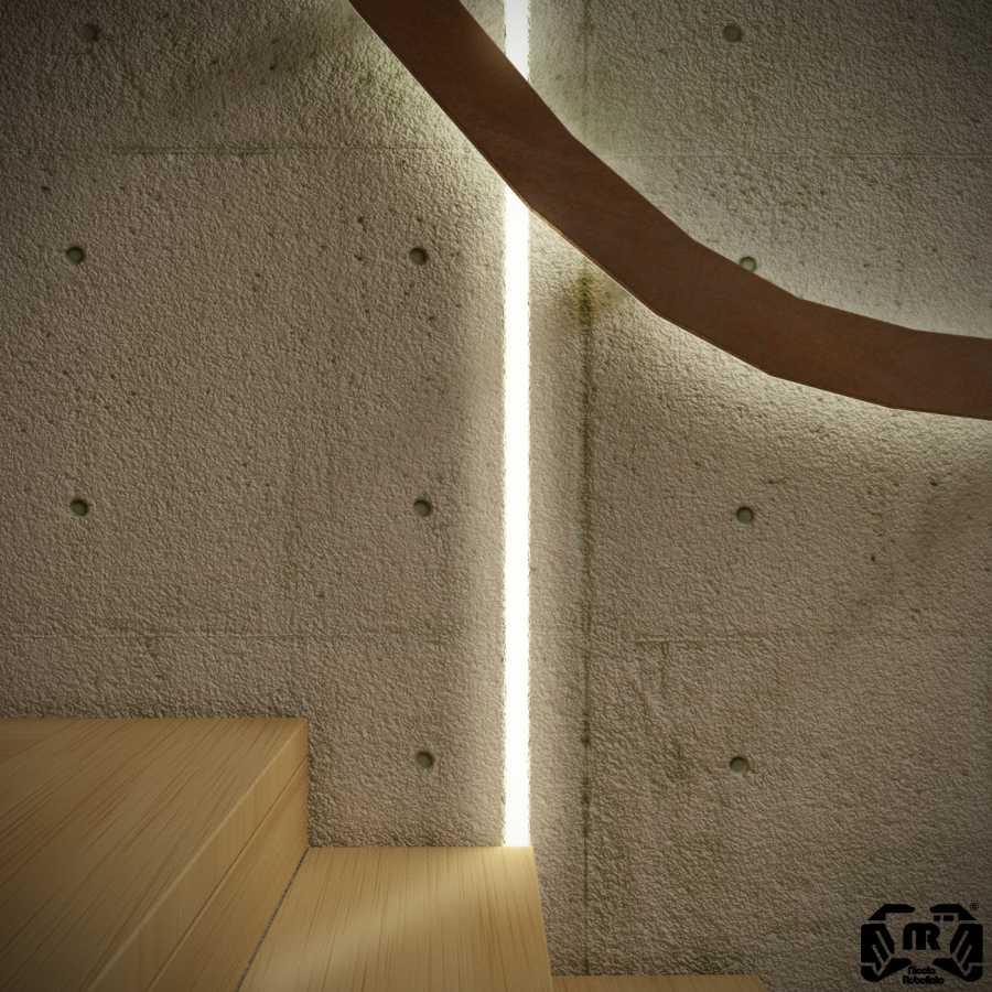 Render di una scala interna realizzata in legno, acciaio corten e calcestruzzo grezzo a vista.