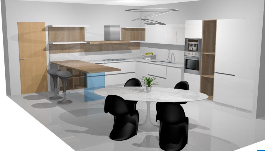 Render realizzato appositamente per il cliente, dove la cucina, il tavolo da pranzo e la relativa illuminazione dedicata sono i protagonisti.